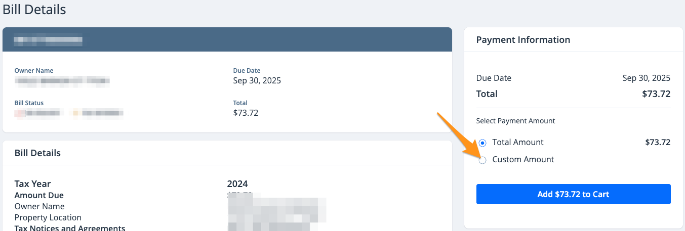 1. Select the bill you wish to pay and choose Custom Amount