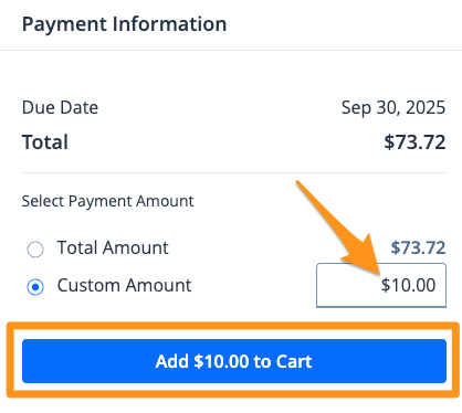 2. Enter your partial payment amount then click Add $--.-- to Cart